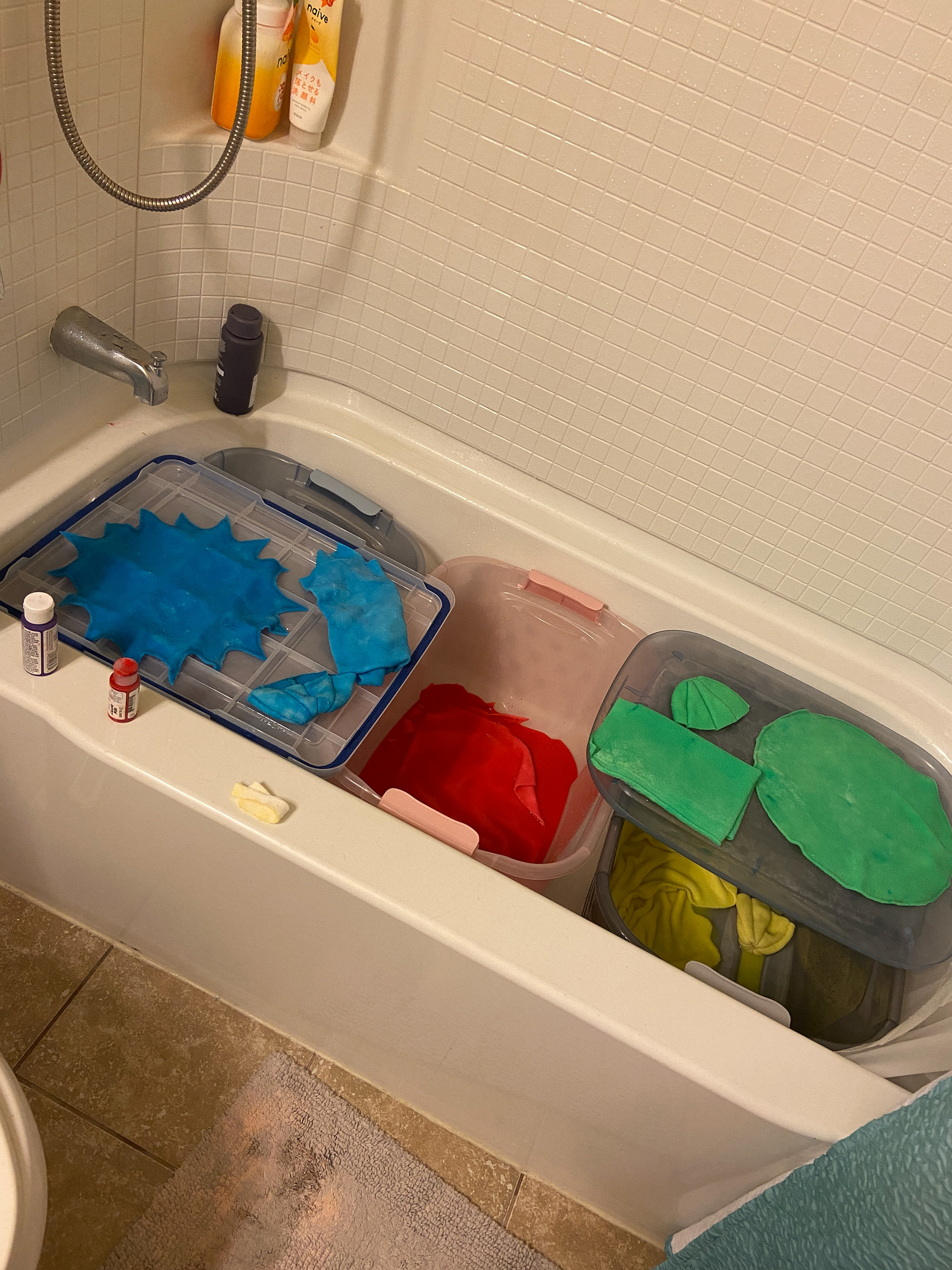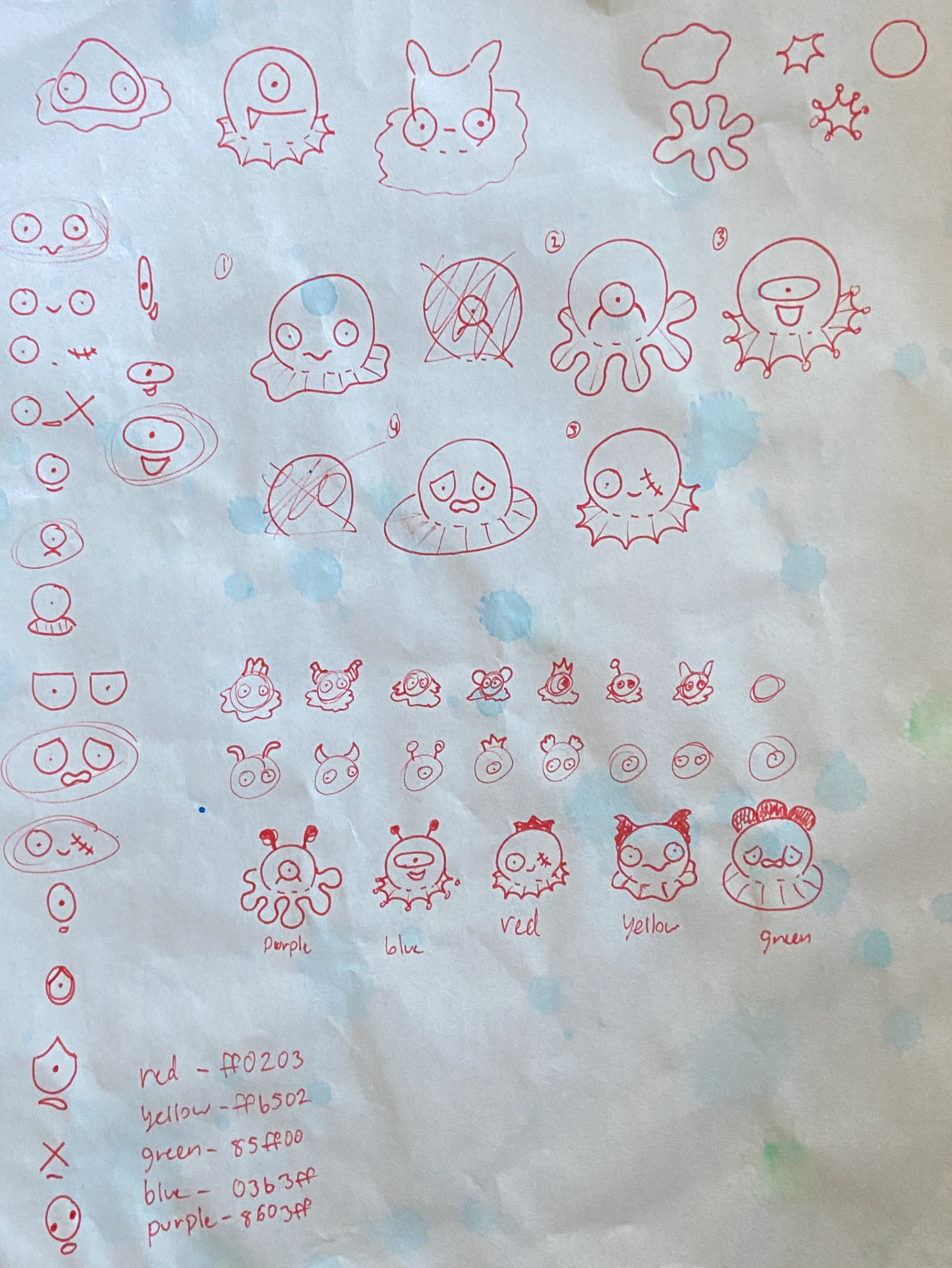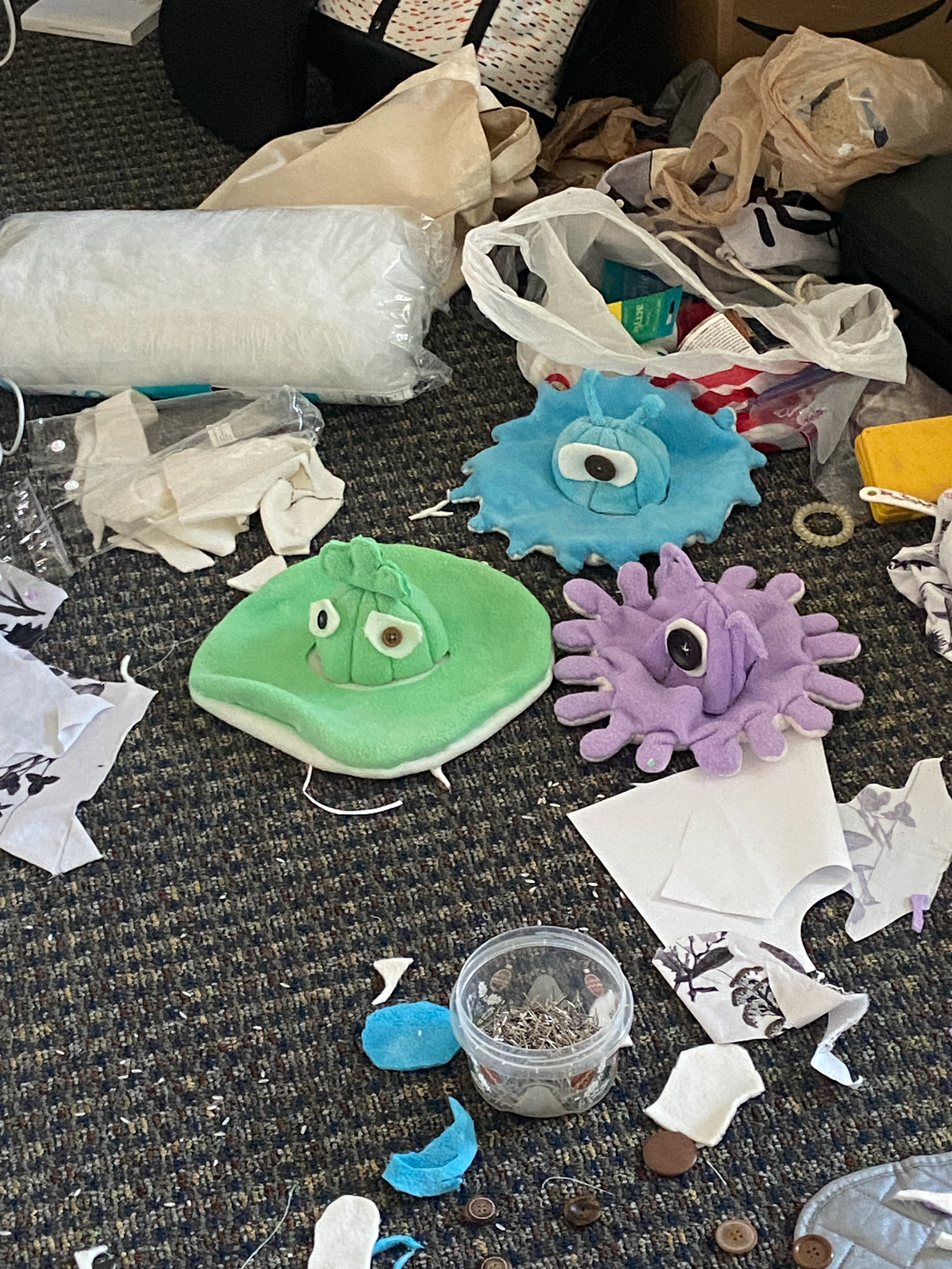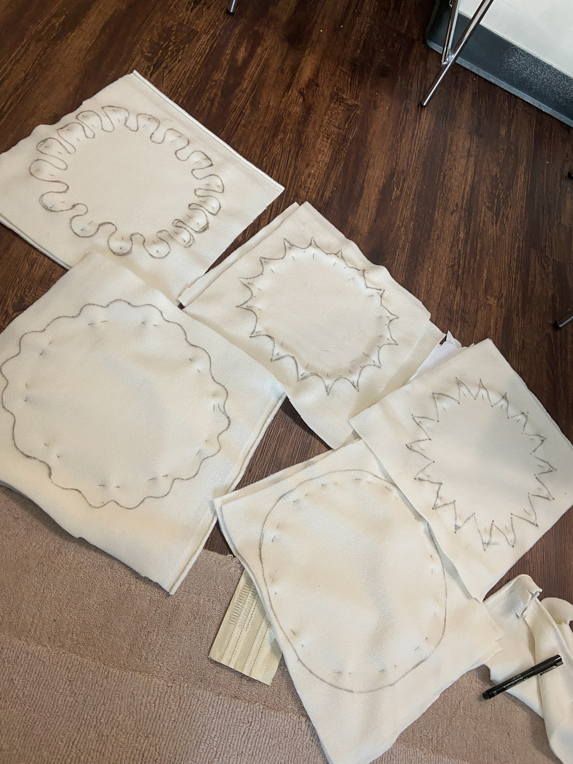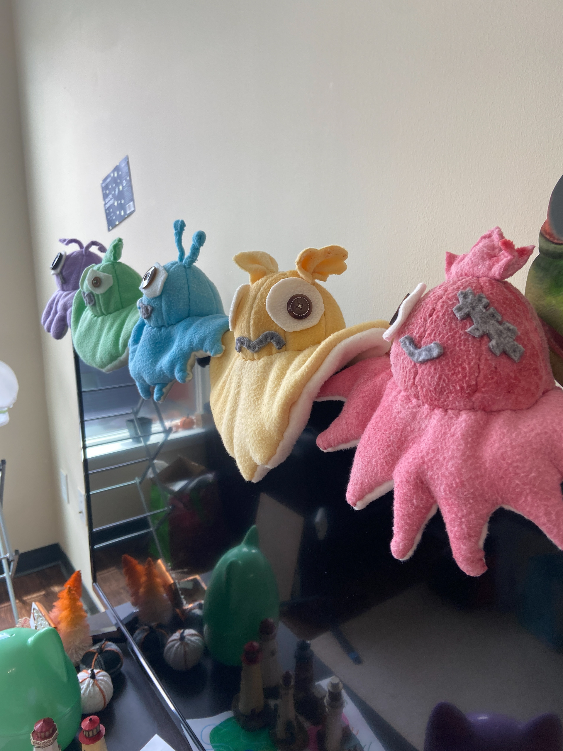 Each whimsical plush pal was lovingly handcrafted from the ground up. Pattern templates were carefully cut out, and vibrant acrylic paints were used to dye the fabric. Lastly, each silly companion was hand-sewn together, stitch by stitch.